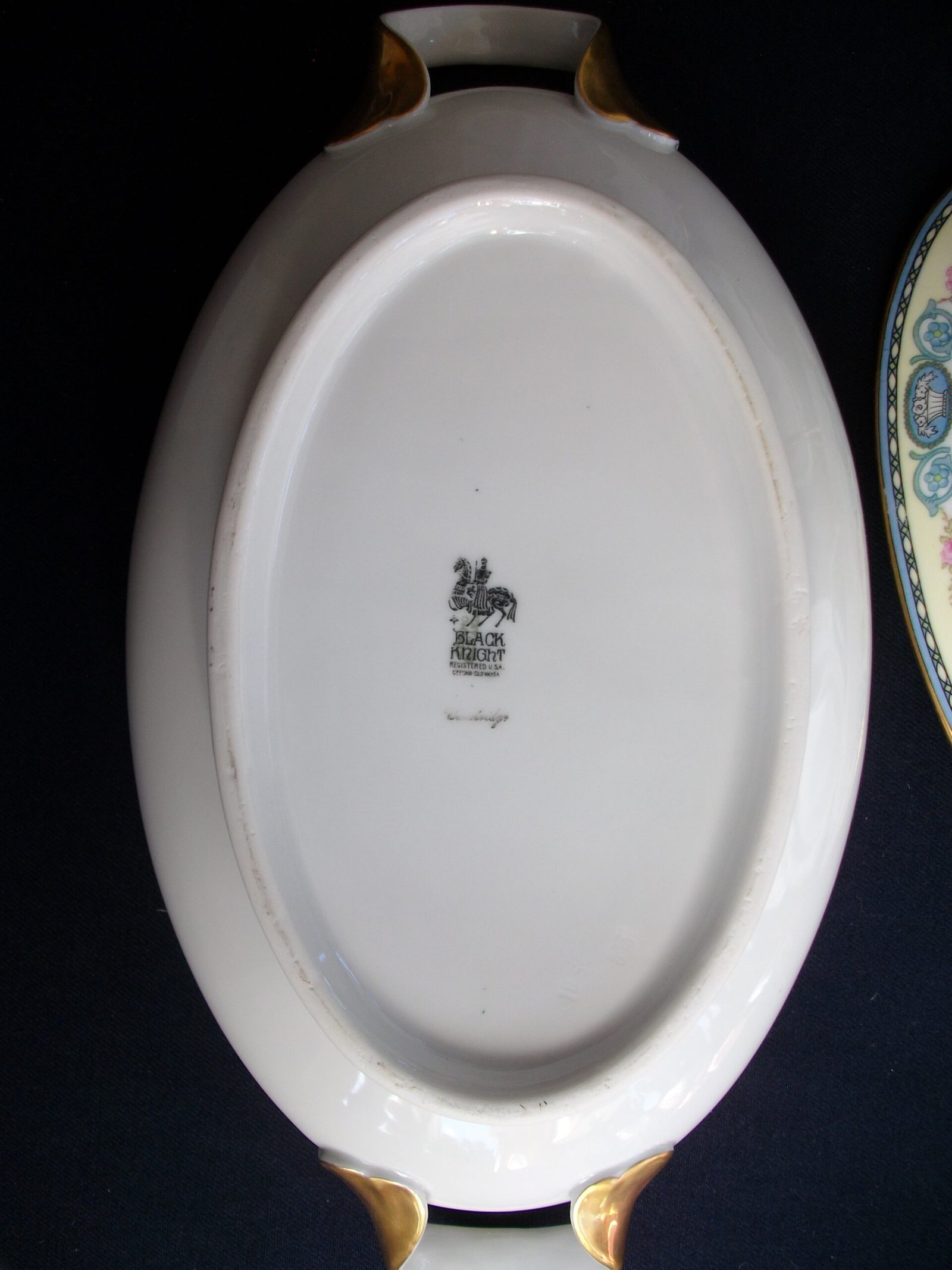 FOR YOUR CONSIDERATION IS A LOVELY OVAL COVERED VEGETABLE TUREEN FROM BOHEMIAN POTTERS GEORG HAAS AND JOHANN CZJZEK *, IN THEIR CAMBRIDGE PATTERN. CAMBRIDGE WAS PRODUCED UNDER BOTH THEIR CROWN IMPERIAL AND BLACK KNIGHT LABELS. THE TUREEN CARRIES THE BLACK KNIGHT MARK DATING IT FROM APPROXIMATELY 1918 TO 1938.