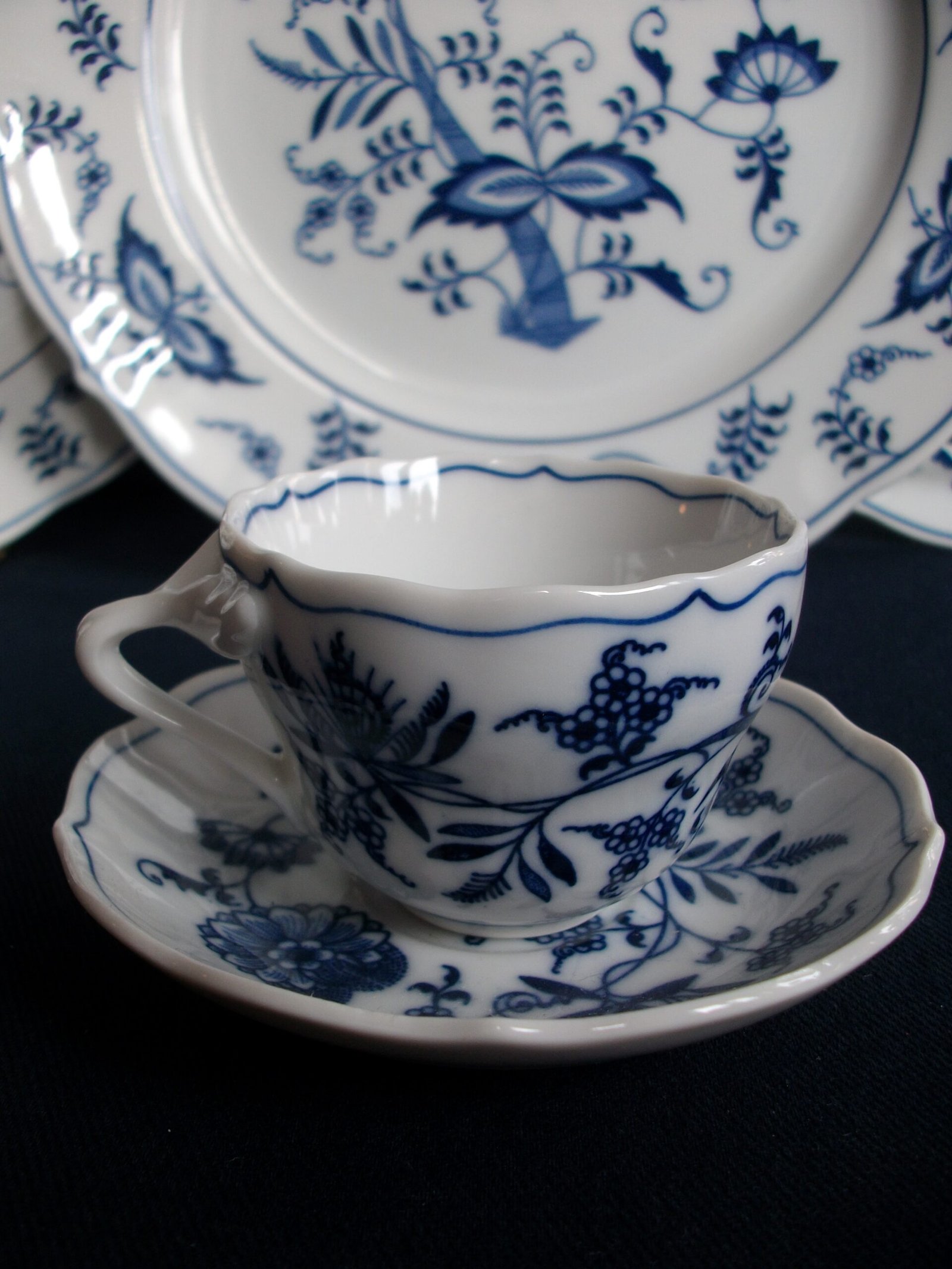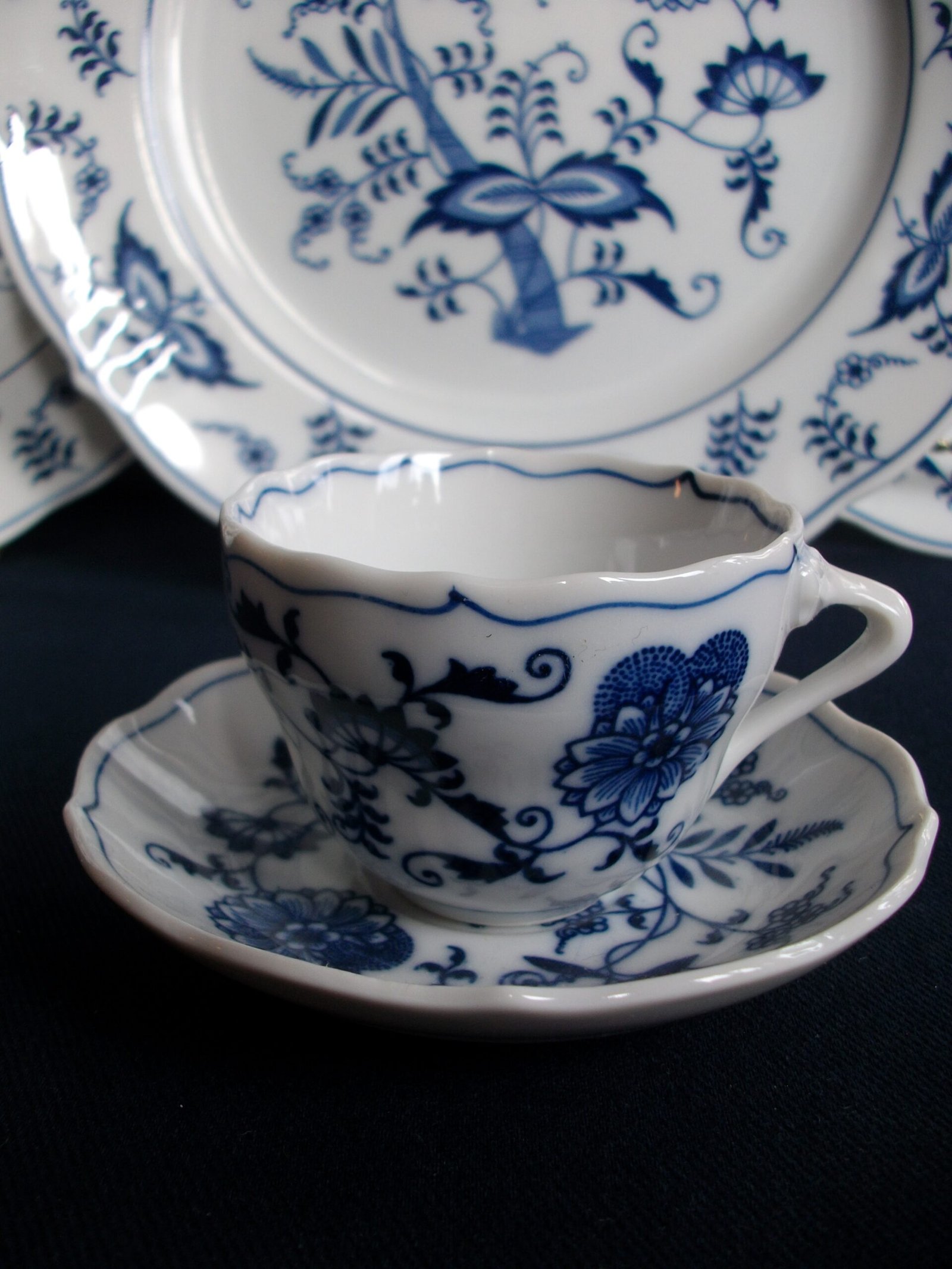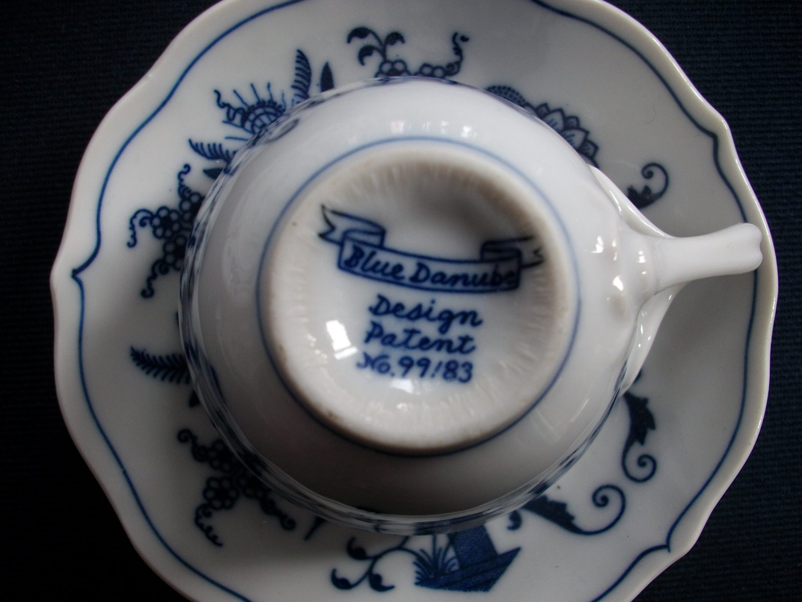 FOR YOUR CONSIDERATION IS A LOVELY DEMI TASSE CUP AND SAUCER FROM BLUE DANUBE* JAPAN, IN THEIR BLUE ONION ** PATTERN. THE ORIGINAL BANNER BACK STAMP DATES THEM FROM AS EARLY AS 1951 TO 1976.