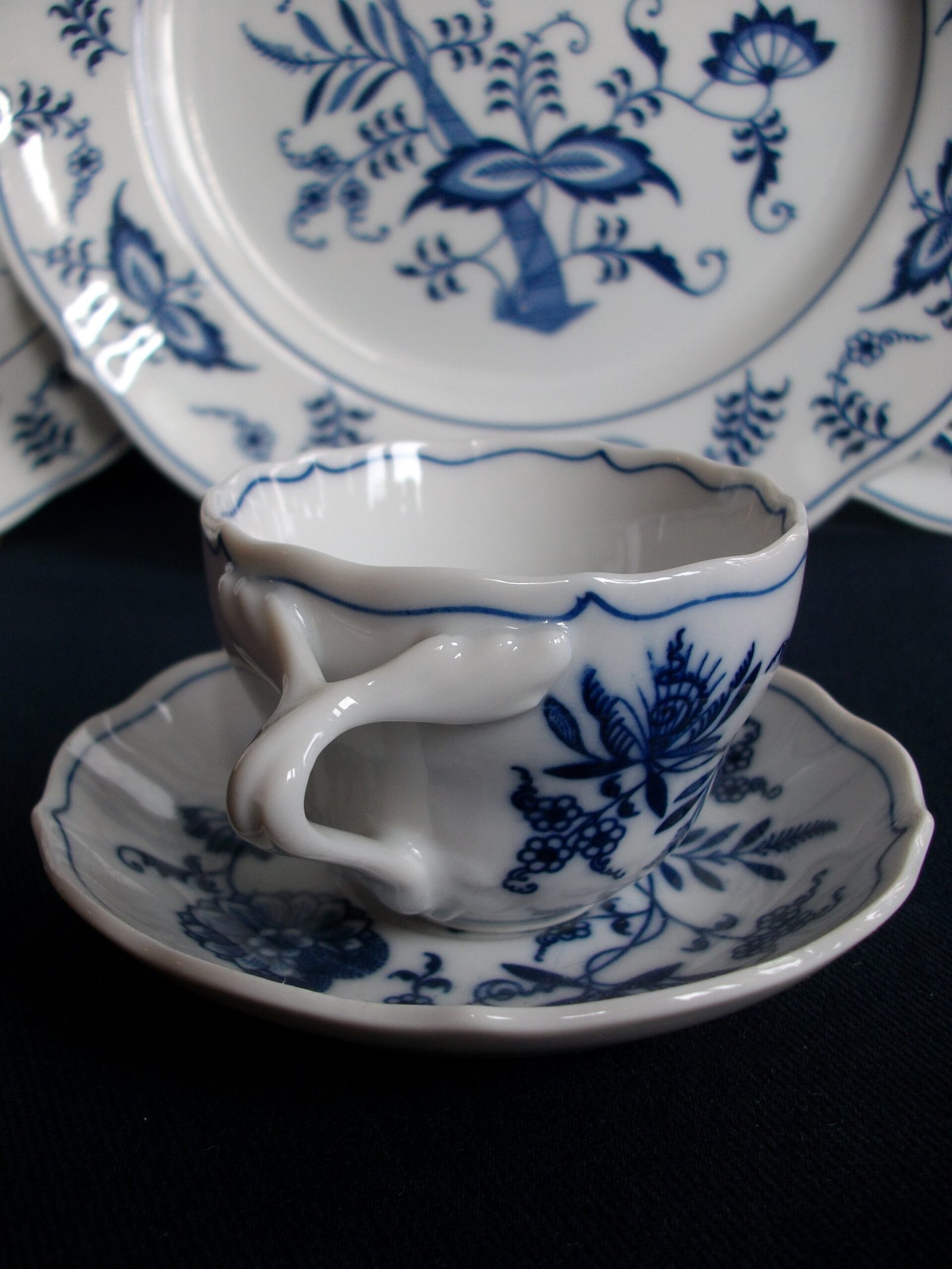 THE DEMI CUP AND SAUCER ARE IN EXCELLENT CONDITION. THERE ARE NO CRACKS, CHIPS OR CRAZING. THE COBALT BLUE AND MEISSEN STYLE PATTERN, UNDER-GLAZED ON FINE TRANSLUCENT PORCELAIN, DISPLAYS GREAT QUALITY!
