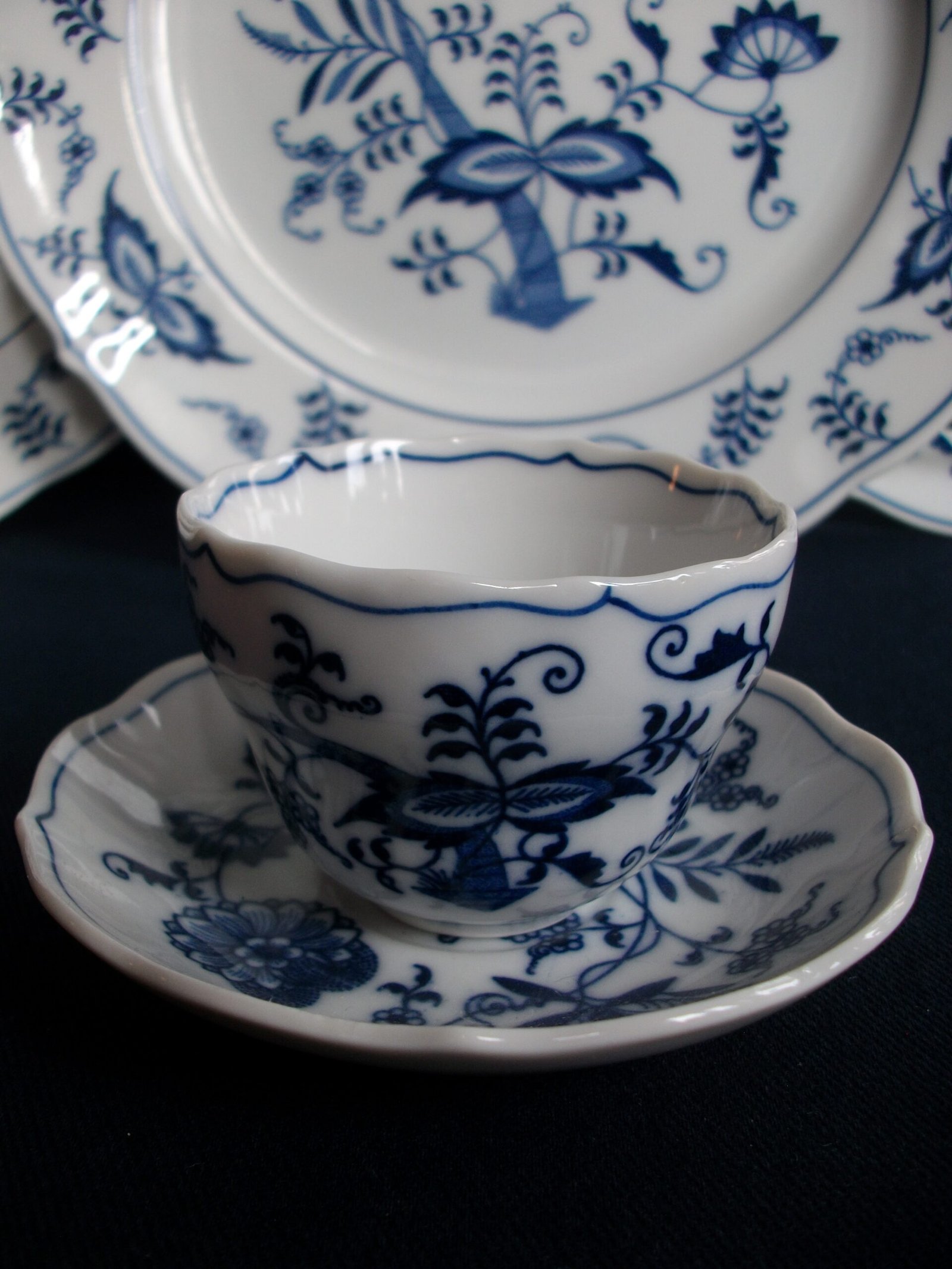 BLUE DANUBE- BLUE ONION (c.1951+) DEMITASSE CUP & SAUCER- BANNER STAMP- EXCELLENT!