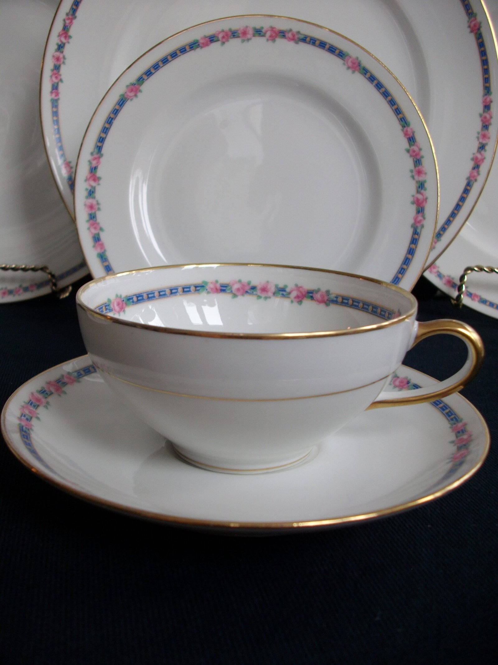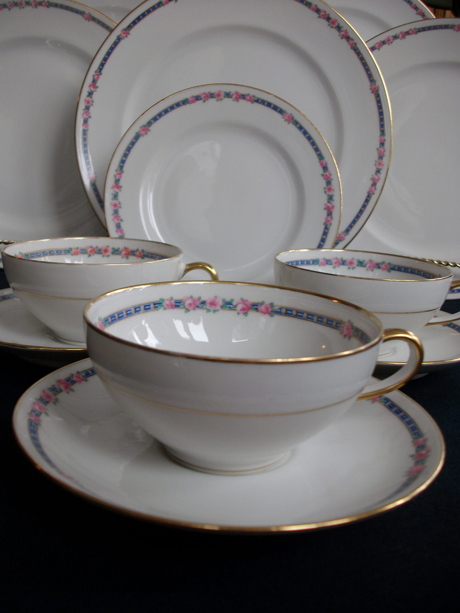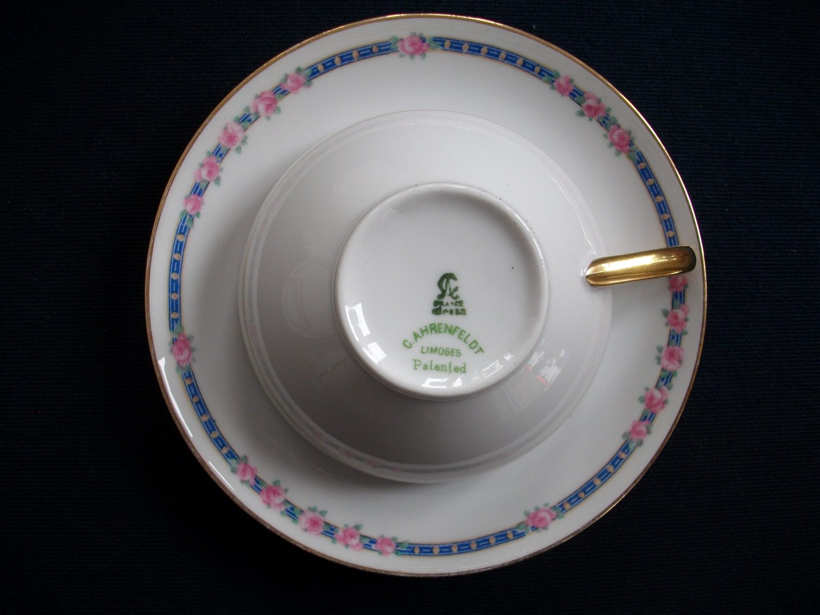 FOR YOUR CONSIDERATION ARE LOVELY CUPS AND SAUCERS OF QUALITY PORCELAIN FROM CHARLES AHRENFELDT** IN A PINK ROSES – BLUE BAND BORDER PATTERN. THE BACK STAMPS DATE THEM FROM 1894 TO THE 1930’s.