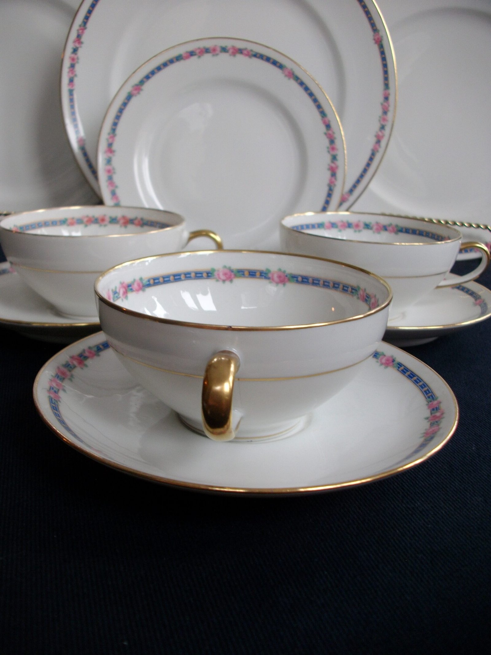 THE CUPS AND SAUCERS ARE IN EXCELLENT CONDITION; THERE ARE NO CHIPS, CRACKS OR CRAZING. THE GILT TRIM IS GREAT…ESPECIALLY FOR ITS AGE ! (SOME SLIGHT RUBBING ON A COUPLE OF SAUCERS…THE CUPS PERFECT .)