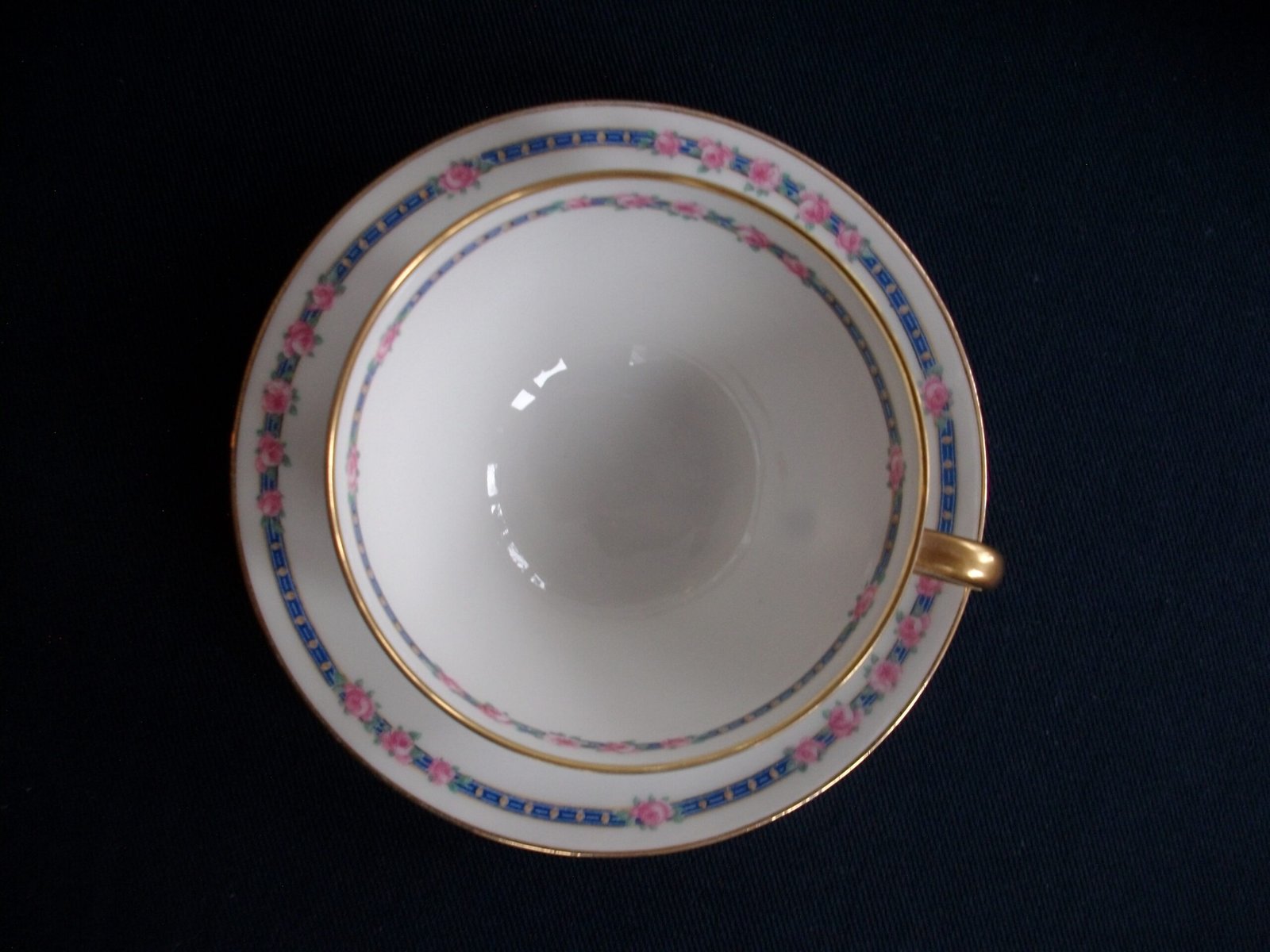 CHARLES AHRENFELDT (CA) LIMOGES- PINK ROSES IN BLUE BAND (c.1894-1930’s)- CUP & SAUCER (s)- EXCELLENT !