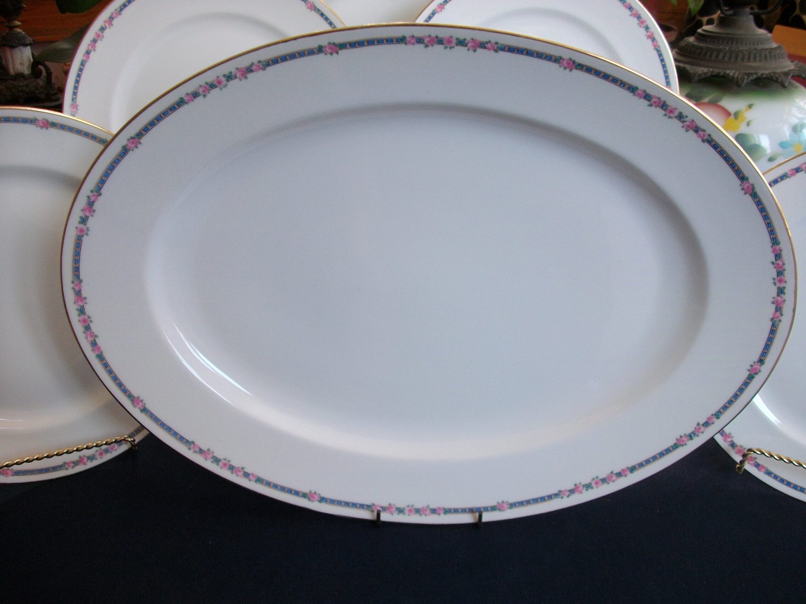 CHARLES AHRENFELDT (CA) LIMOGES- PINK ROSES IN BLUE BAND (c.1894-1930’s)  SERVING PLATTER- 16 1/2″-  EXCELLENT !