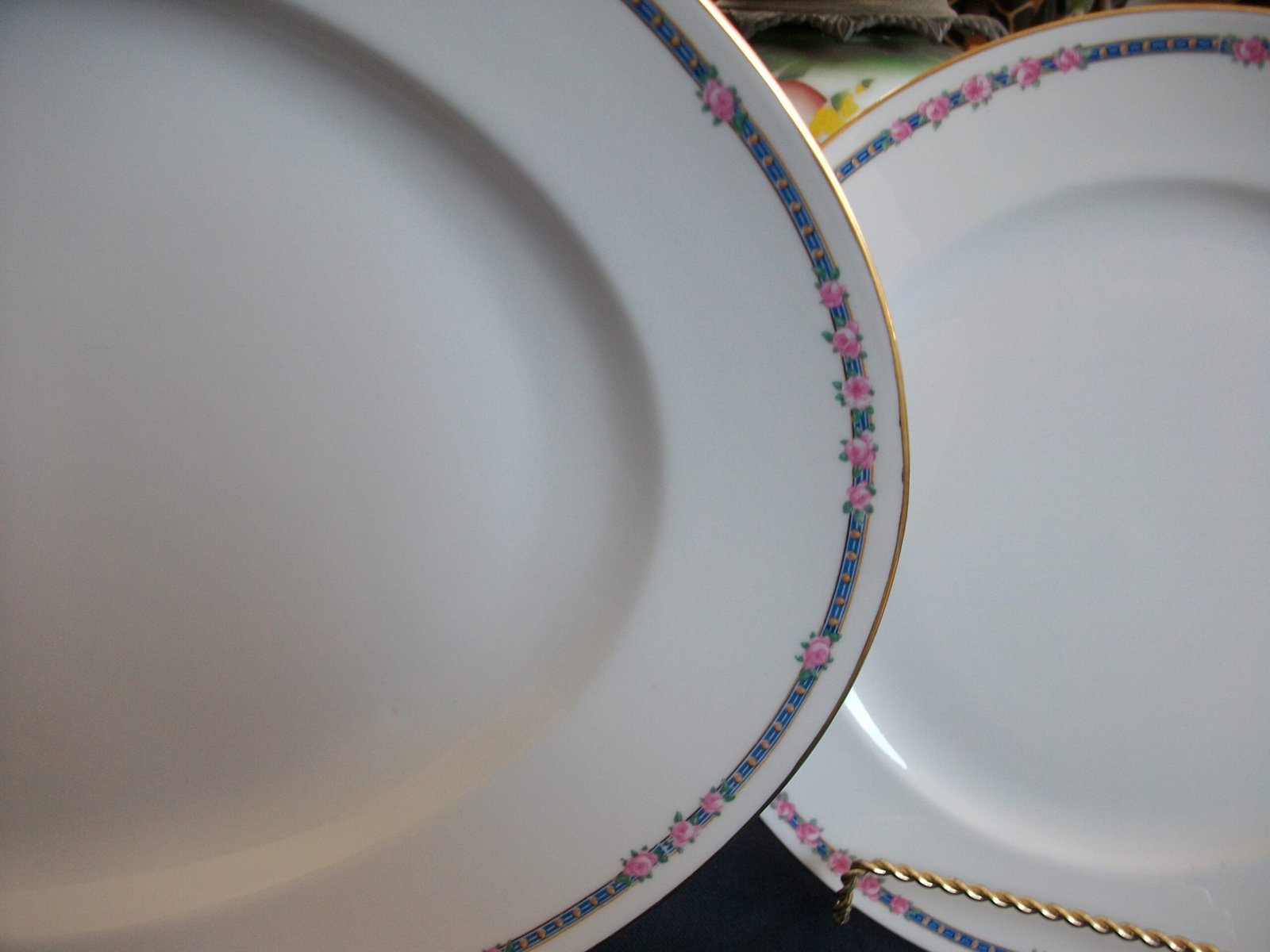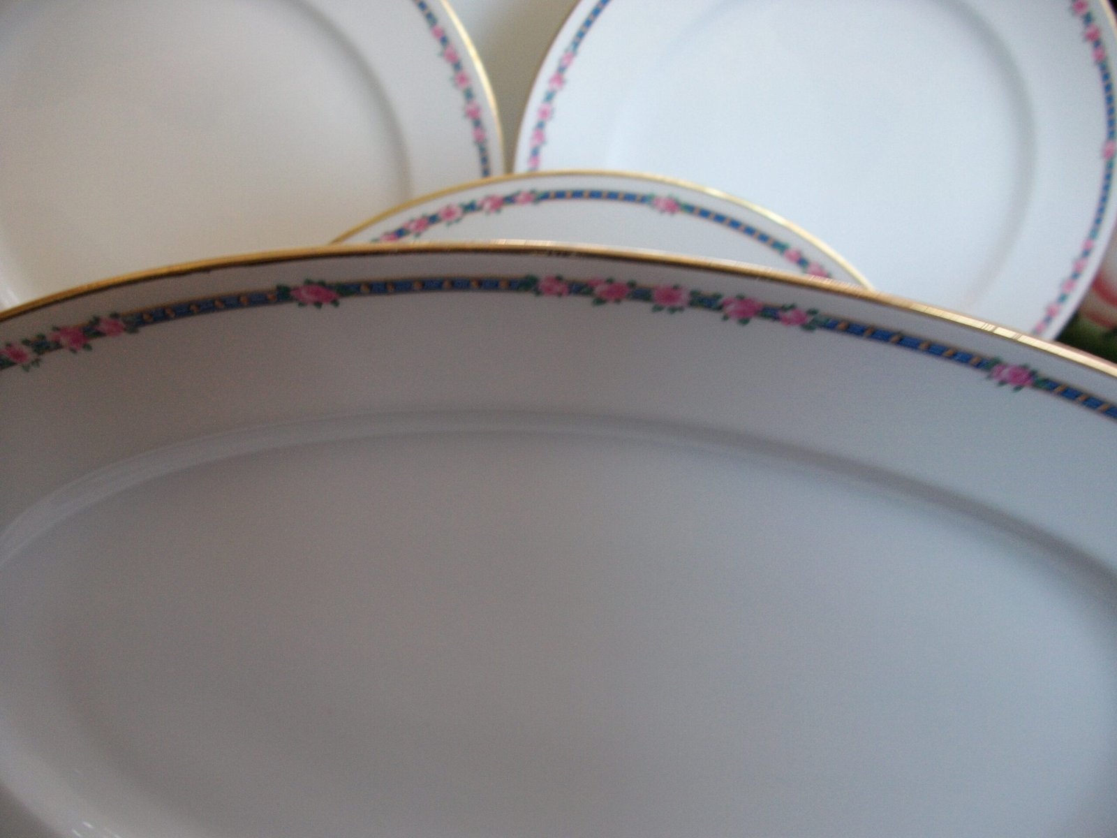 THE PATTERN OF ROSES WITHIN A BLUE BAND ALONG THE RIM BORDER IS SIMPLE YET CAN BE USED IN A FORMAL SETTING, WHETHER ALL IN THIS DESIGN OR IN A MIX  CREATED BY YOU.
