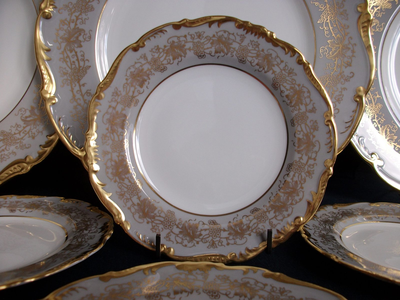 THE PATTERN IS IN ROCOCO STYLE, HAVING A GREY BORDER EMBELLISHED WITH APPLIED GILT, WITH A GRAPE AND VINE MOTIF, SHAPED ENCRUSTED GOLD RIM, ON A WHITE GROUND.