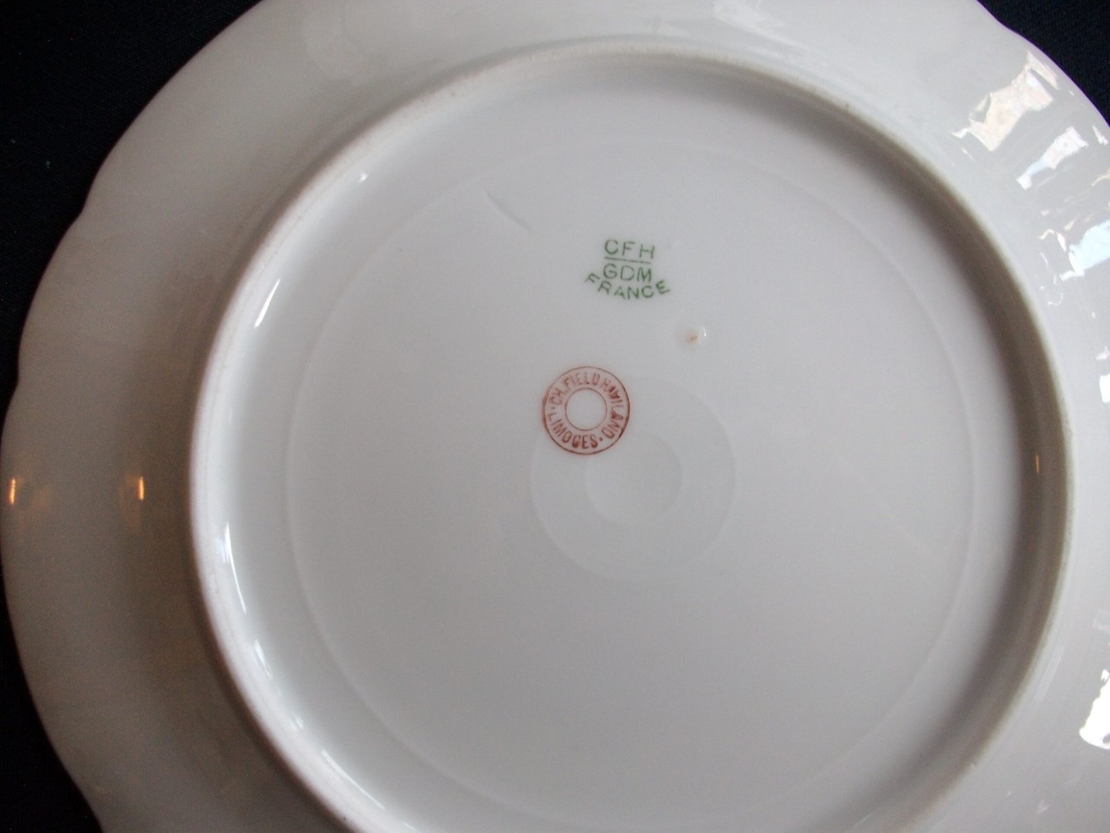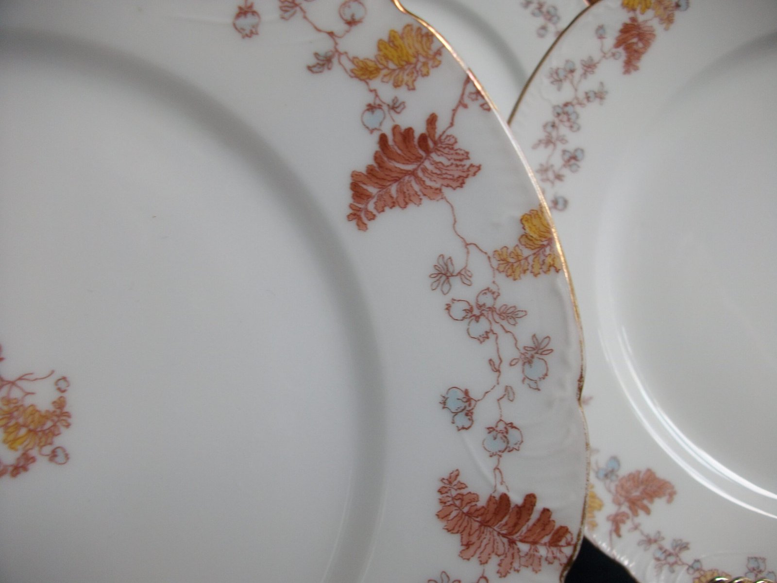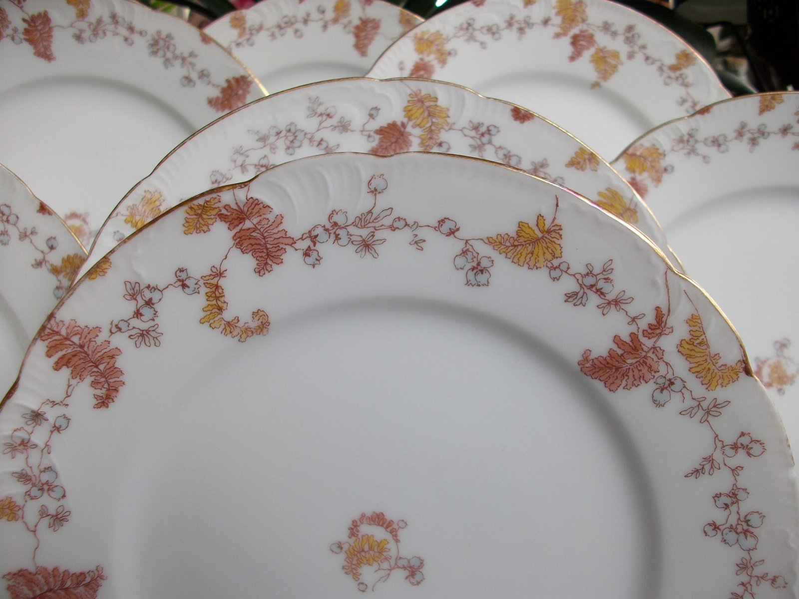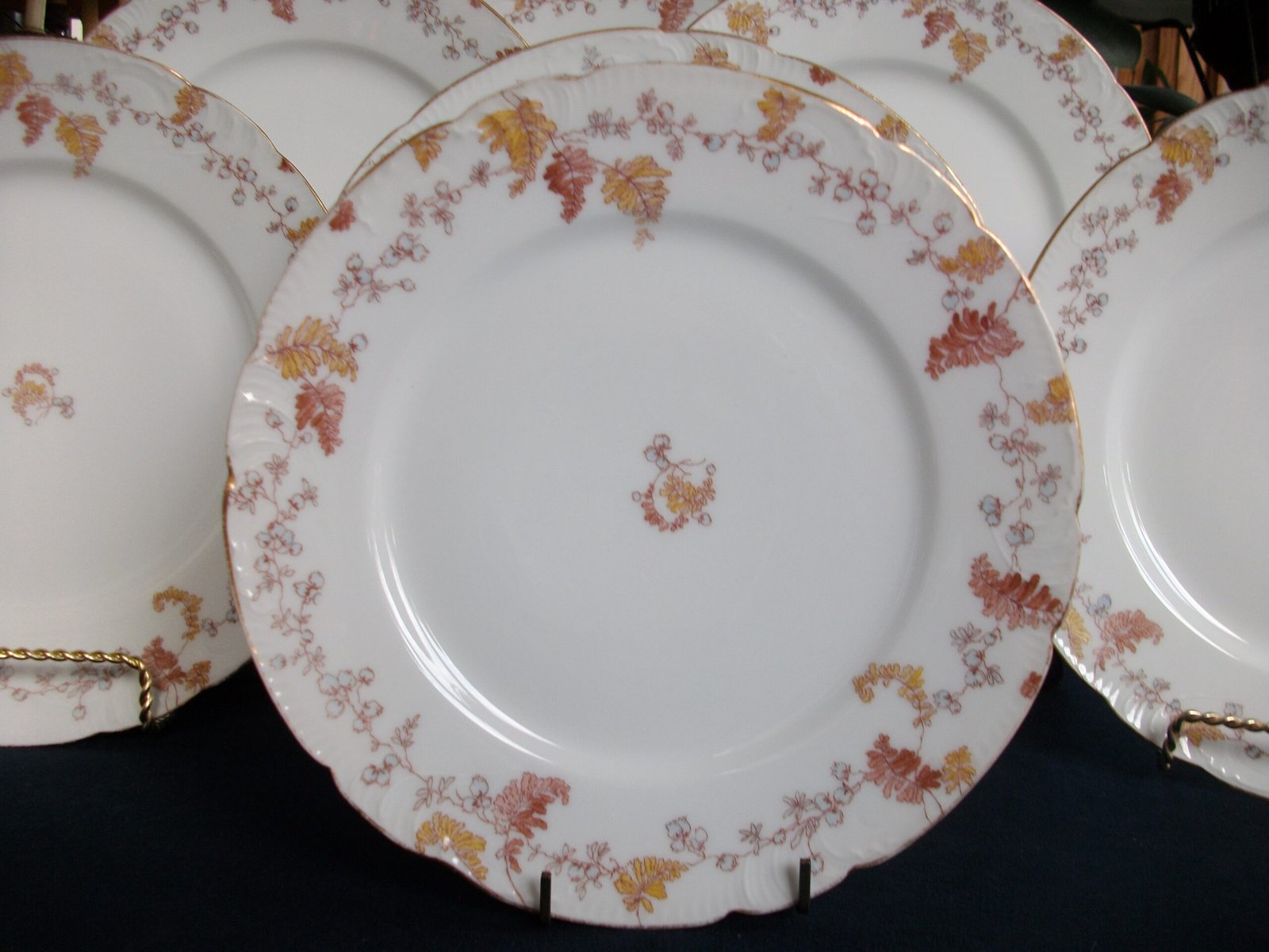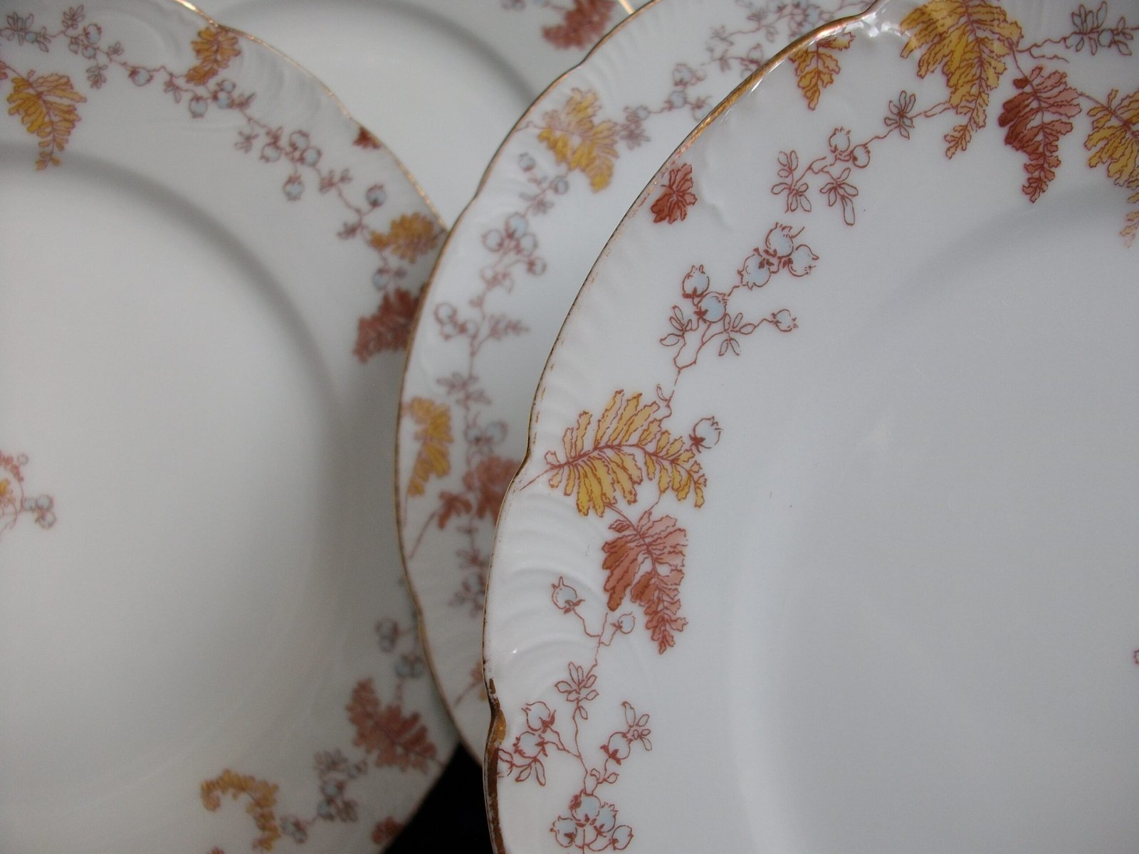 FOR YOUR CONSIDERATION ARE LOVELY 8 1/2 INCH LUNCHEON PLATES OF FINE PORCELAIN FROM CHARLES FIELD HAVILAND (CFH), AND GERARD, DUFRAISSEIX AND MOREL (GDM) IN A PATTERN THAT I CALL AUTUMN . THE BACK STAMPS DATE THEM FROM ABOUT 1891 TO 1900.