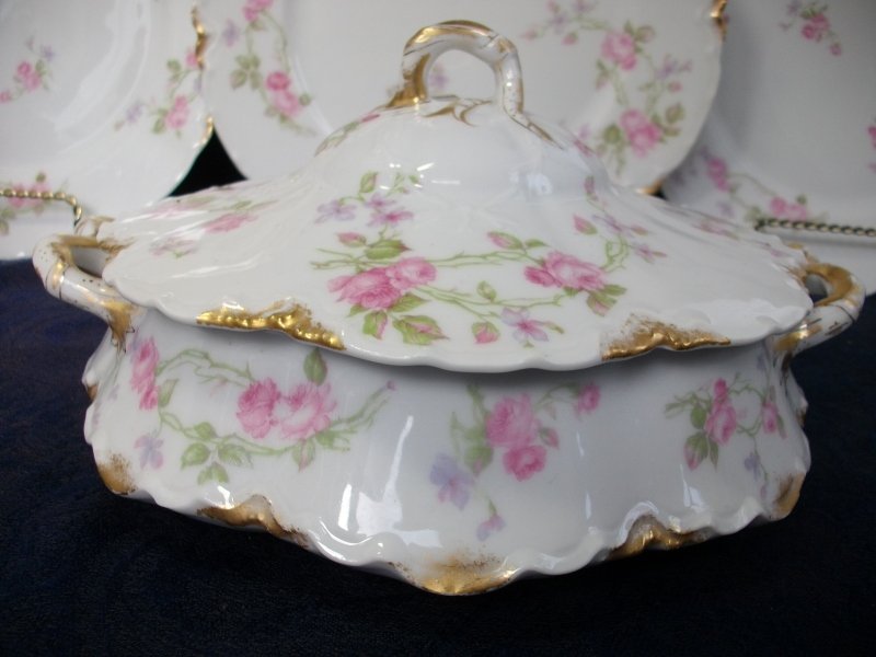 FOR YOUR CONSIDERATION IS A LOVELY ANTIQUE COVERED SERVING BOWL FROM THE HAVILAND COMPANY IN WHAT I CALL THEIR SCATTERED ROSES PATTERN. THE BACKSTAMP*** DATES IT TO AS EARLY AS 1894.