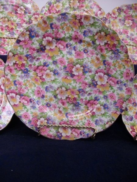 THE LUNCH PLATE IS IN EXCELLENT CONDITION CONSIDERING ITS AGE. THERE ARE NO CRACKS OR CHIPS BUT THERE IS CRAZING …. NOT REALLY NOTICEABLE WITH THE BUSY CHINTZ PATTERN. THE GILT TRIM IS GREAT !!