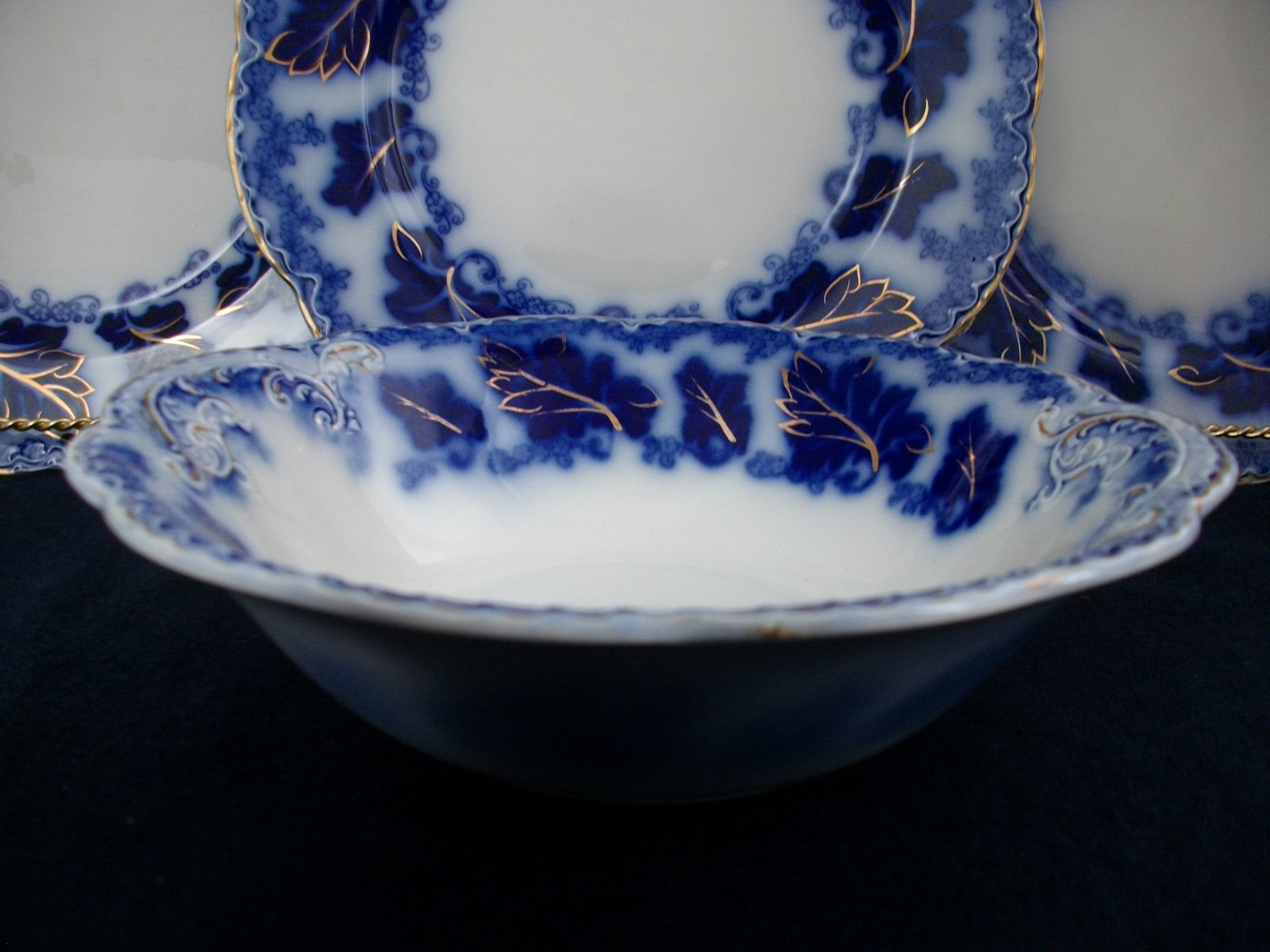 THE SERVING BOWL IS IN EXCELLENT CONDITION CONSIDERING ITS AGE. THERE ARE NO CRACKS, CHIPS, OR CRAZING; A WEE SCRATCH OR TWO ON THE BOWL BOTTOM. THE GILT TRIM AND ACCENTS ARE GREAT !! (SOME WEAR TO THE GILT AT “HANDLES” AND ALONG RIM EDGE.)