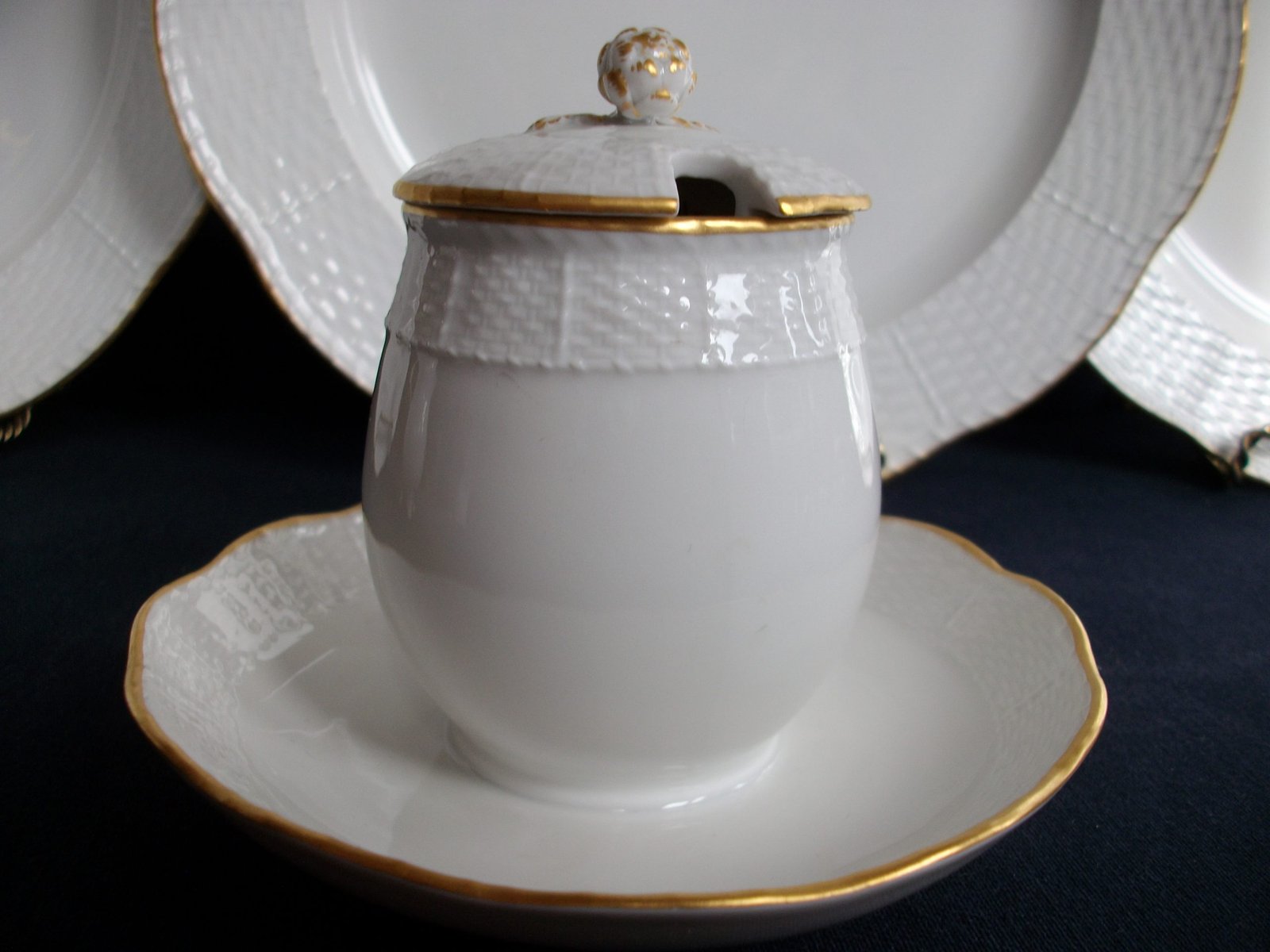 FOR YOUR CONSIDERATION IS A LOVELY COVERED SUGAR BOWL WITH ATTACHED UNDER PLATE FROM KONIGLICHE PORZELLAN MANUFAKTUR BERLIN (KPM) IN THEIR HIGH END NEUOSIER 05 PATTERN. NEUOSIER WAS FIRST INTRODUCED IN 1770 AND IS STILL IN PRODUCTION TODAY; THE PATTERN SEEING SLIGHT CHANGES OVER THE YEARS.