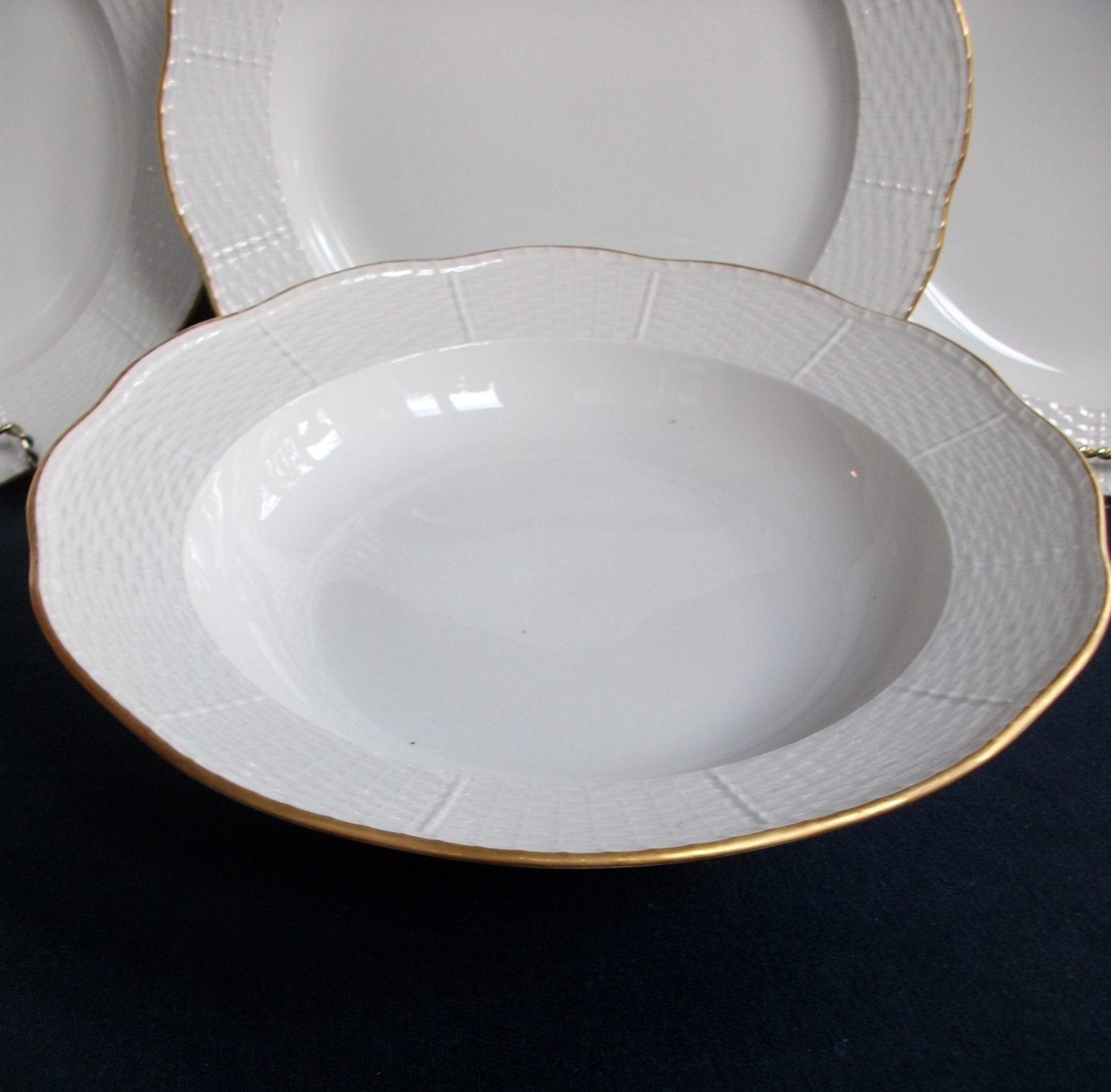 THE SCALLOPED RIM  SOUP PLATES ARE IN EXCELLENT  CONDITION …. APPEAR RARELY USED.  THERE ARE NO CRACKS, CHIPS OR CRAZING; PERHAPS A WEE SCRATCH OR TWO ON THE PLATE FACE. THE GILT IS GREAT !!