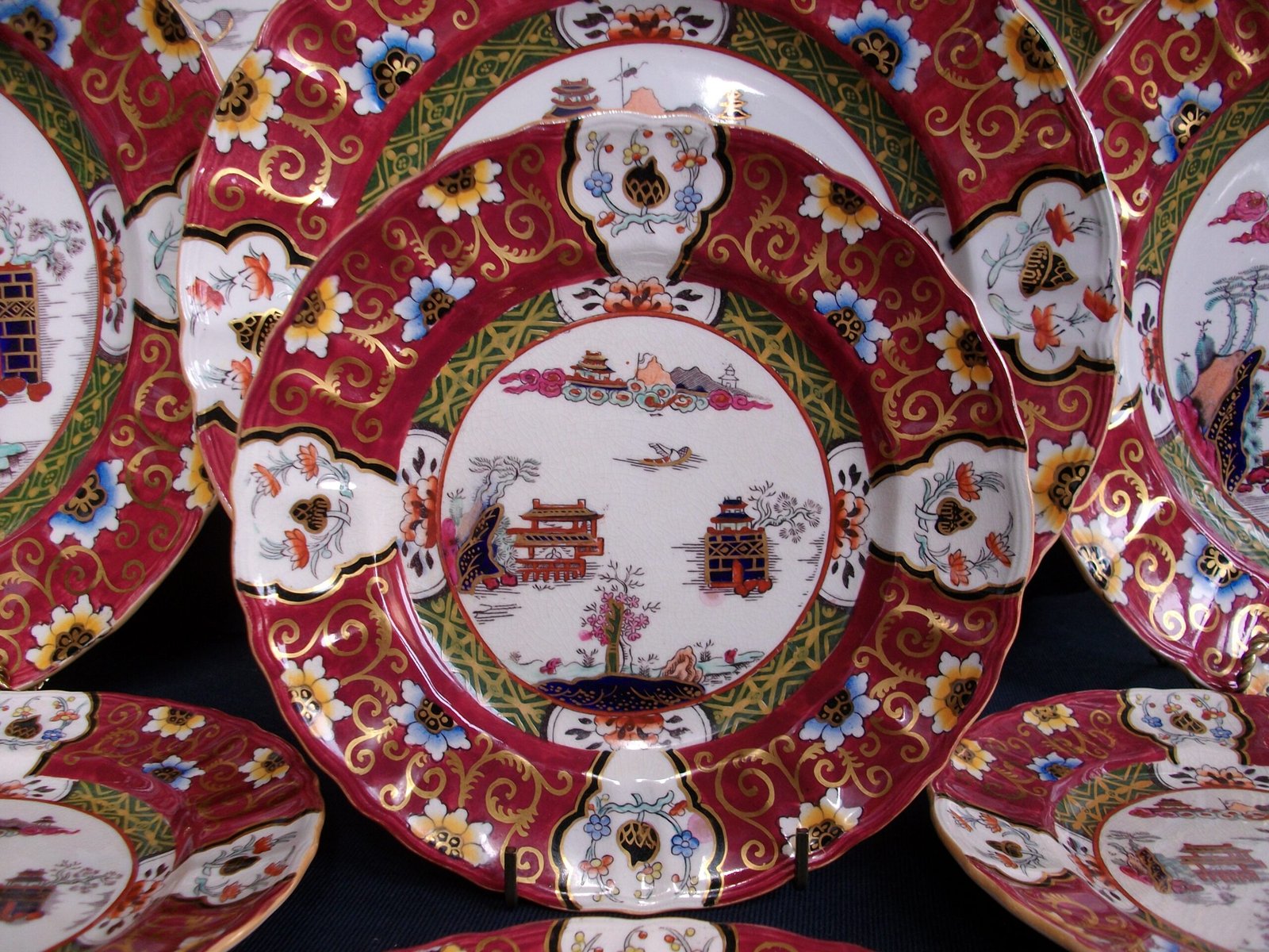 THE COLOURFUL IMARI PATTERN OF CHINOISERIE SCENES AND DESIGNS  INCLUDES GENEROUS GILT ACCENTS AND OUTLINES. THE SCALLOPED EDGE HAS A BURNT  ORANGE COLOUR TRIM.