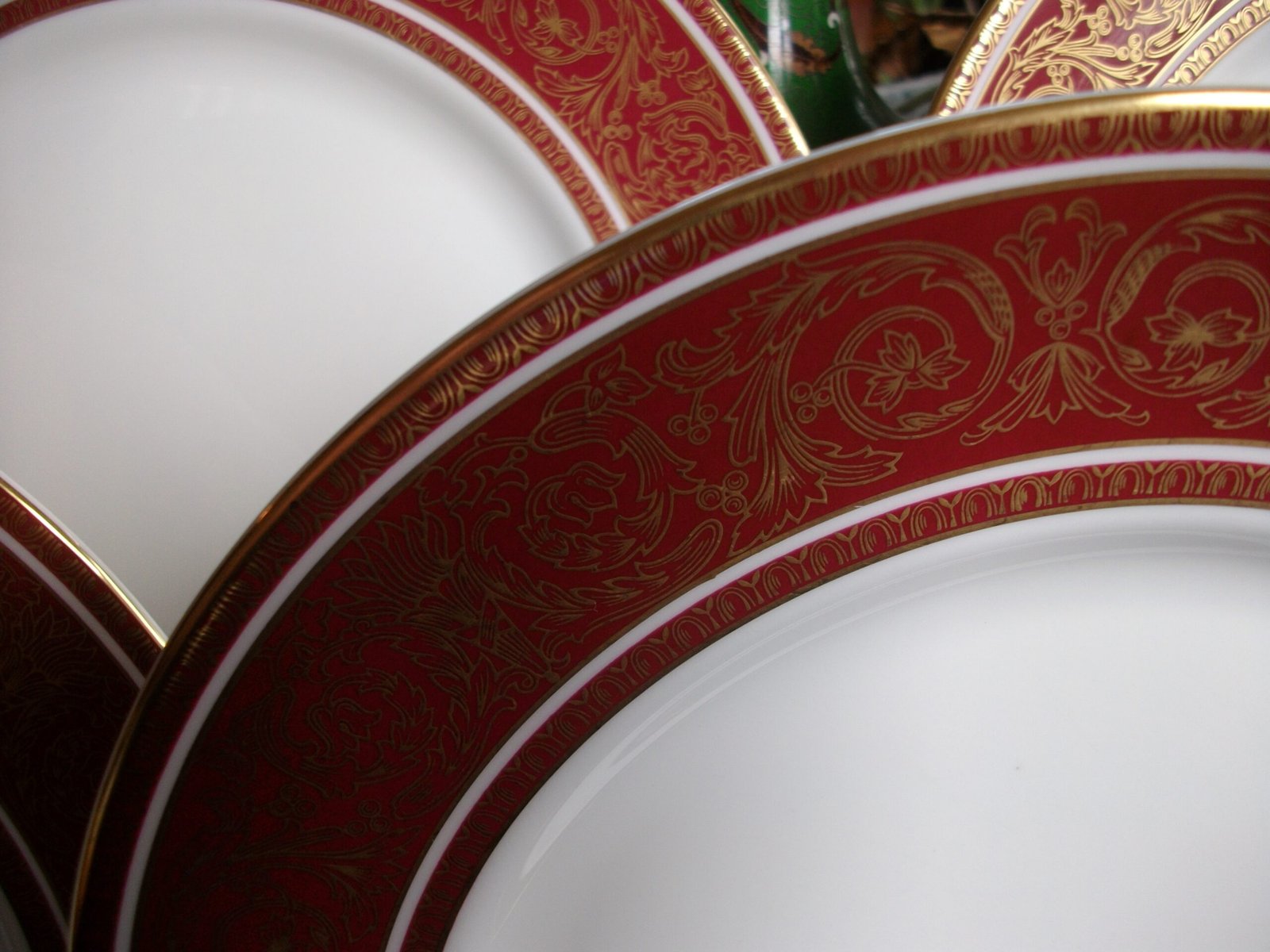 THE DINNER PLATES ARE IN EXCELLENT USED CONDITION. THERE ARE NO CRACKS, CHIPS, OR CRAZING, ALTHOUGH THERE ARE A NUMBER OF SCRATCHES ON THE PLATE FACE. THE GILT SCROLL DESIGN AND ACCENTS ARE GREAT !! THEY WOULD BE MOST PRESENTABLE ON THE SUNDAY DINNER TABLE.
