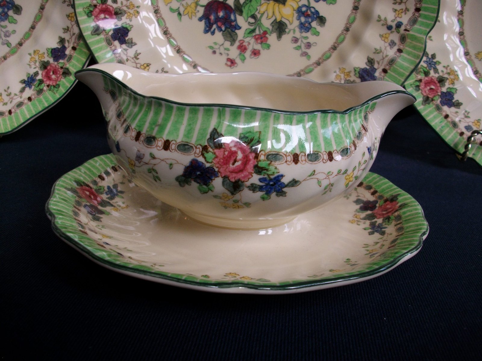 ROYAL DOULTON THE VERNON- GREEN (c.1930’s) GRAVY BOAT WITH ATTACHED SAUCER- RARE!! EXCELLENT!!
