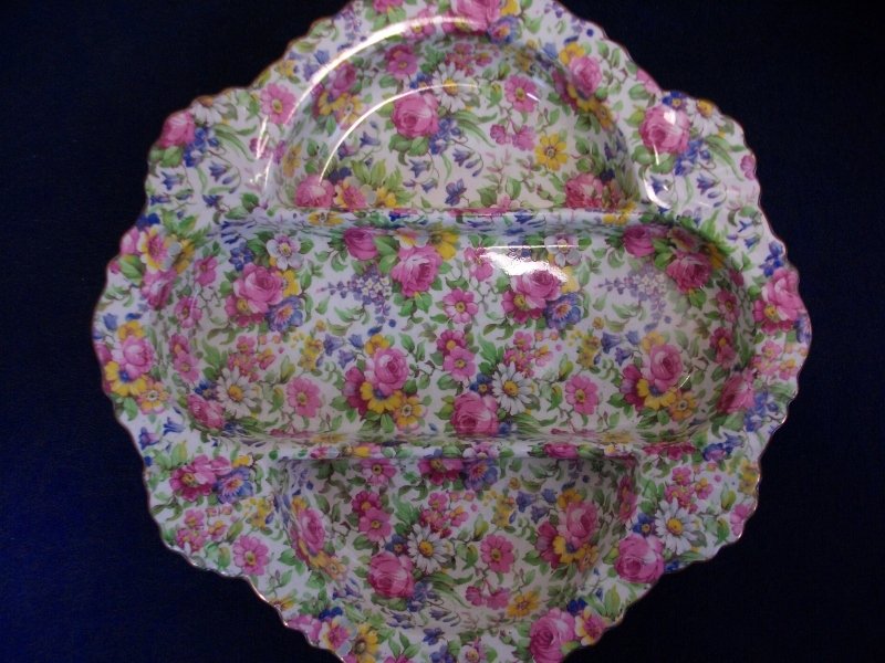 ROYAL WINTON GRIMWADES SUMMERTIME CHINTZ (c.1934-50) 3 PART RELISH DISH 9 5/8″- MARINA SHAPE – EXCELLENT !! RARE !!