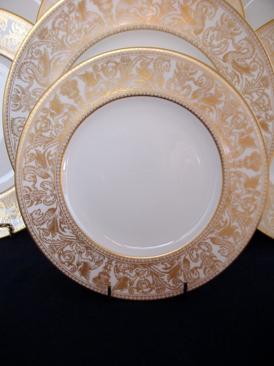 FOR YOUR CONSIDERATION ARE LOVELY 8 1/8 INCH SALAD PLATES FROM WEDGWOOD IN THEIR FLORENTINE GOLD W4219 PATTERN. THE BACK STAMP DATE THEM FROM 1962. FLORENTINE GOLD HAD A PRODUCTION RUN UNTIL 1986. (MOST OF THE SALAD PLATES HERE HAVE THE EARLIER GREEN MARK.)
