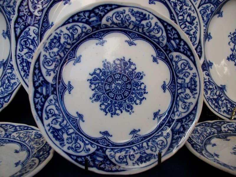 THE PATTERN OF BLUE GRIFFINS AND FRUIT BASKETS IS A WONDERFUL EXAMPLE OF SIMPLE TRADITIONAL VICTORIAN BLUE AND WHITE !! THE EDGE IS SLIGHTLY SCALLOPED.