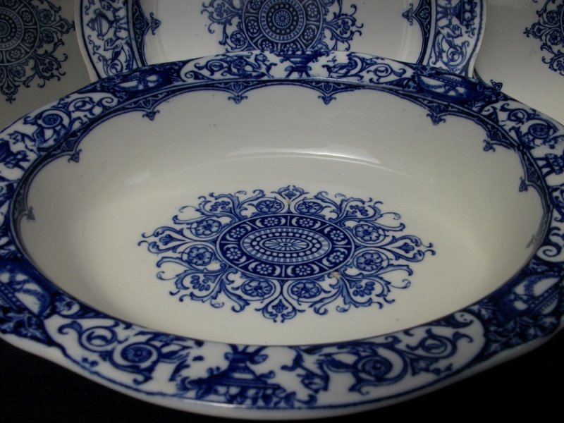 THE PATTERN OF BLUE GRIFFINS AND FRUIT BASKETS IS A WONDERFUL EXAMPLE OF SIMPLE TRADITIONAL VICTORIAN BLUE AND WHITE !!