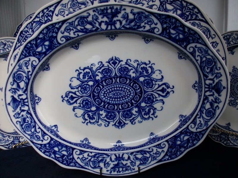 THE PATTERN OF BLUE GRIFFINS AND FRUIT BASKETS IS A WONDERFUL EXAMPLE OF SIMPLE TRADITIONAL VICTORIAN BLUE AND WHITE !!