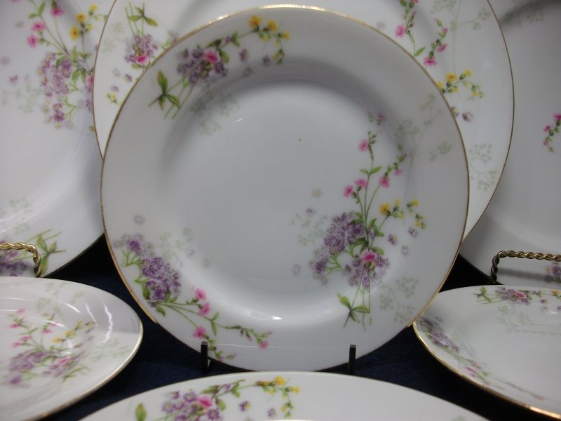 FOR YOUR CONSIDERATION ARE LOVELY 6 1/4 INCH BREAD AND BUTTER PLATES FROM WILLIAM GUERIN AND BAWO & DOTTER (ELITE WORKS) IN WHAT I CALL THEIR PURPLE ASTERS, YELLOW & PINK FLORAL SPRAYS PATTERN. THE BACKSTAMP*** DATE THEM FROM AS EARLY AS 1900 TO 1932.